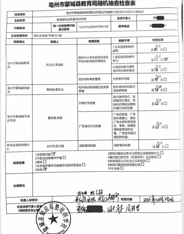 | 名称: | 蒙城县知运私塾培训随机抽查学校 | 文号: | 无 |