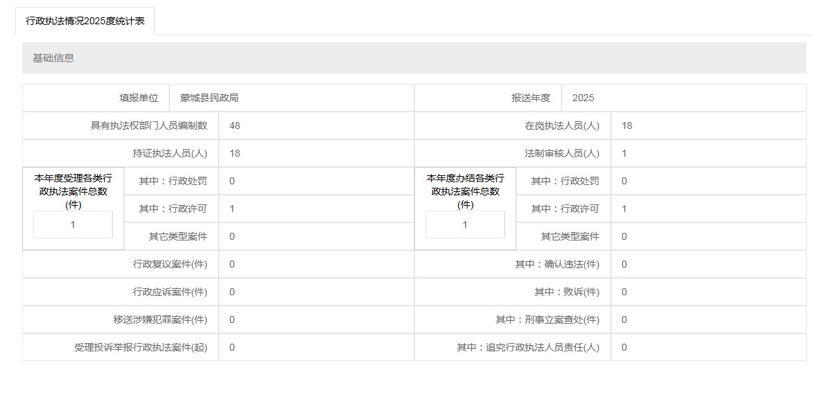 | 名称: | 蒙城县民政局2025年度行政执法年报统计表 |