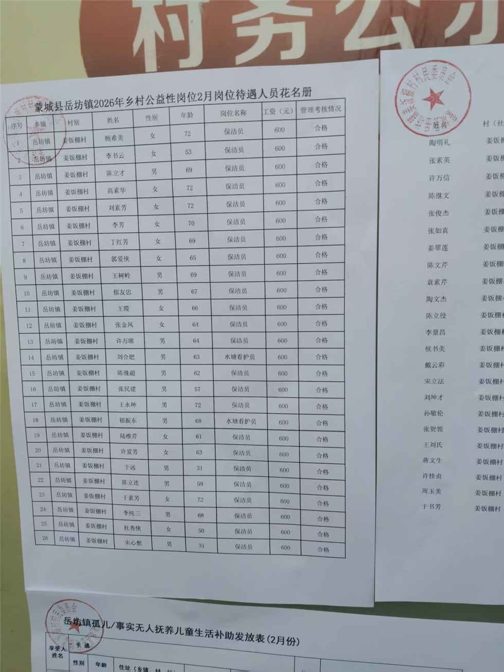 | 名称: | 岳坊镇姜饭棚村2026年2月份惠民惠农补贴资金发放公示 |