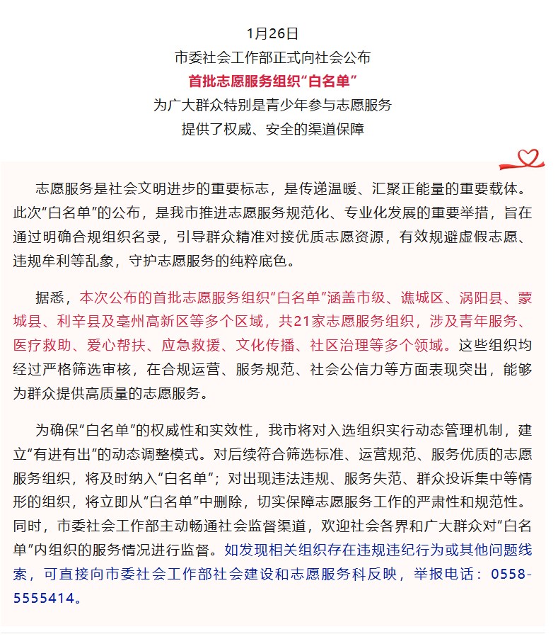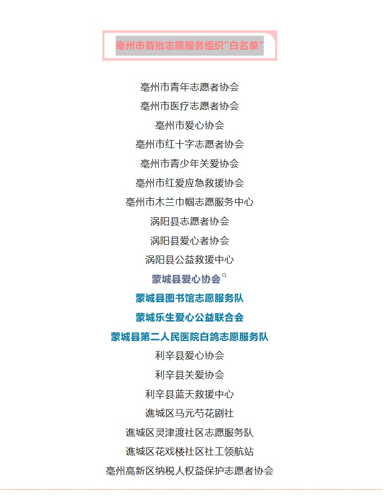 | 名称: | 蒙城二院入选亳州市首批志愿服务组织“白名单” |