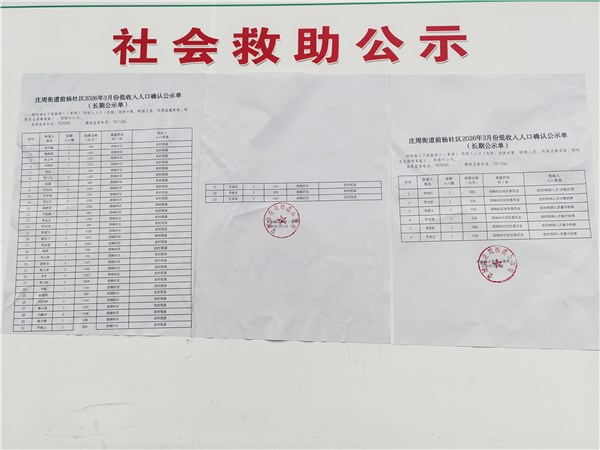 | 名称: | 庄周街道前杨社区2026年3月份惠民惠农补贴资金发放公示情况 |