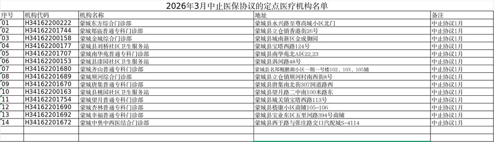 | 名称: | 2026年3月中止医保协议的定点医疗机构公示 | 文号: | 无 |