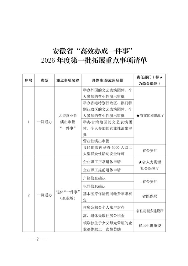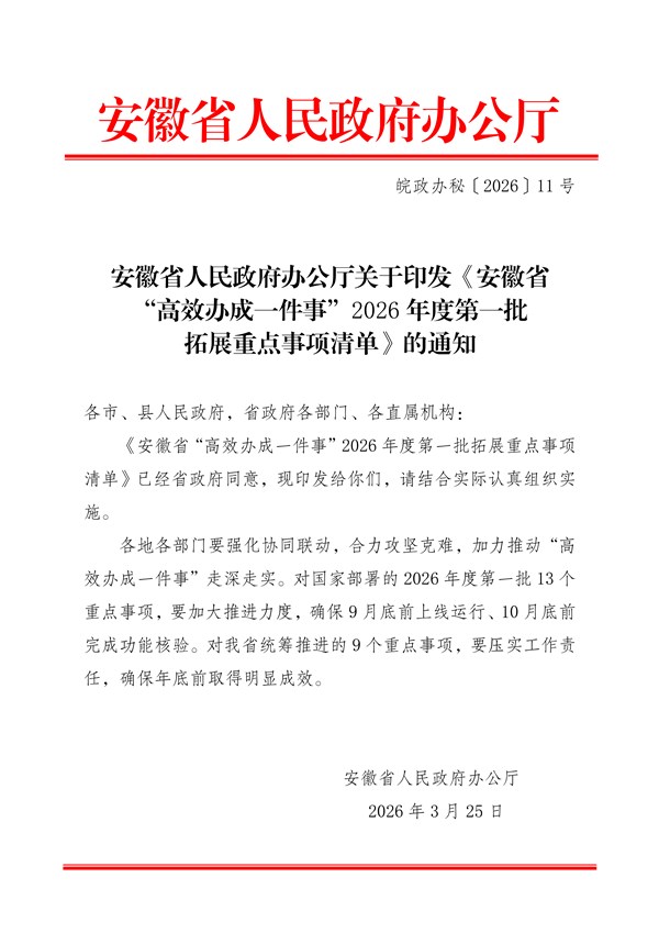 | 名称: | 安徽省人民政府办公厅关于印发《安徽省“高效办成一件事”2026年度第一批拓展重点事项清单》的通知 | 文号: | 无 |